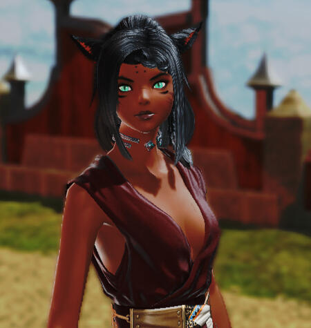 The Warlord of the Firespeakers, a shamanistic branch of the U tribe that once resided out in Paglth'an, but was shoved out of their ancestral home by the sudden appearance of tempered creatures and people en masse. Most of the clan, themselves, had fallen under this corruption, and she fought her way to the closest U sept with two tribe sisters that escaped alongside her.
